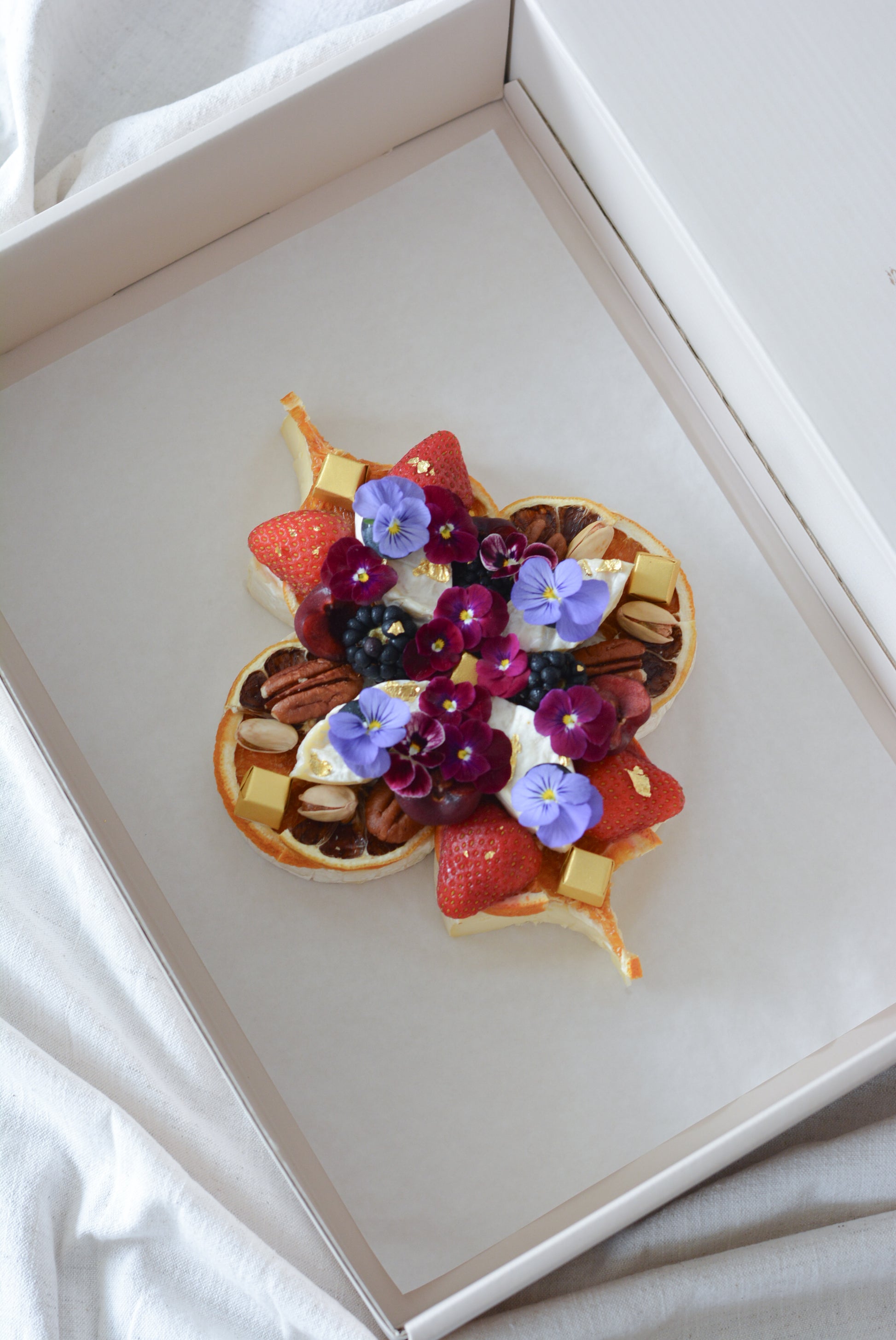 A beautifully carved camembert inspired by moroccan tile motifs, adorned with a vibrant selections of fruits, nuts, quiche paste and chocolate gem. Paired with fig pepper jam, hazelnut chocolate spread, honeycomb, artisan crackers